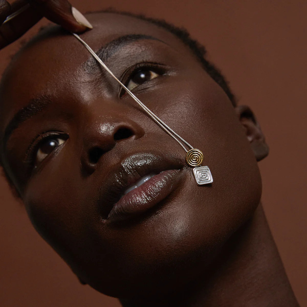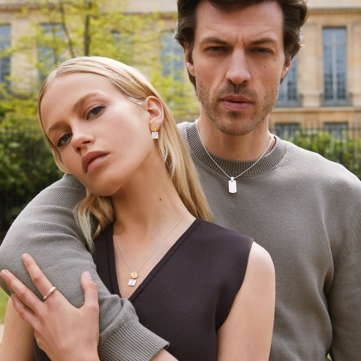 Once a royal playground, the Tuileries Garden in Paris delighted visitors with its intricate landscaped labyrinthe. Honouring the spirit of exploration, this incredibly glamorous pendant captivates with her spiral maze-like patterning. The sterling silver square drops from a yellow gold-plated circle, forming a striking two-tone design. The pendant’s hidden bale threads onto an Italian-crafted silver chain, which features a generous extension for length play.